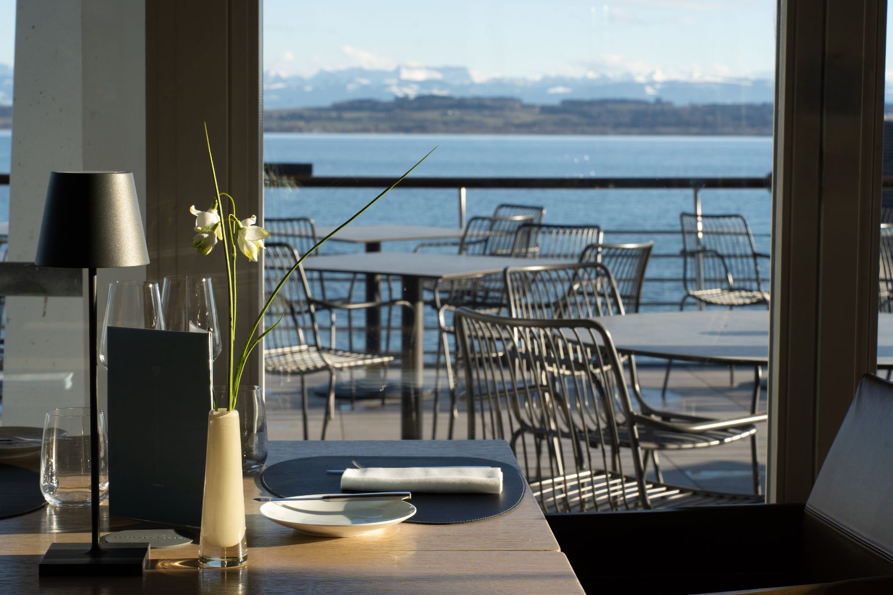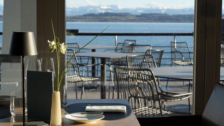 De jour comme de nuit, le ciel se confond aux eaux du lac de Neuchâtel et sa lumière descendante nimbe la salle ou la terrasse d’une ambiance unique.